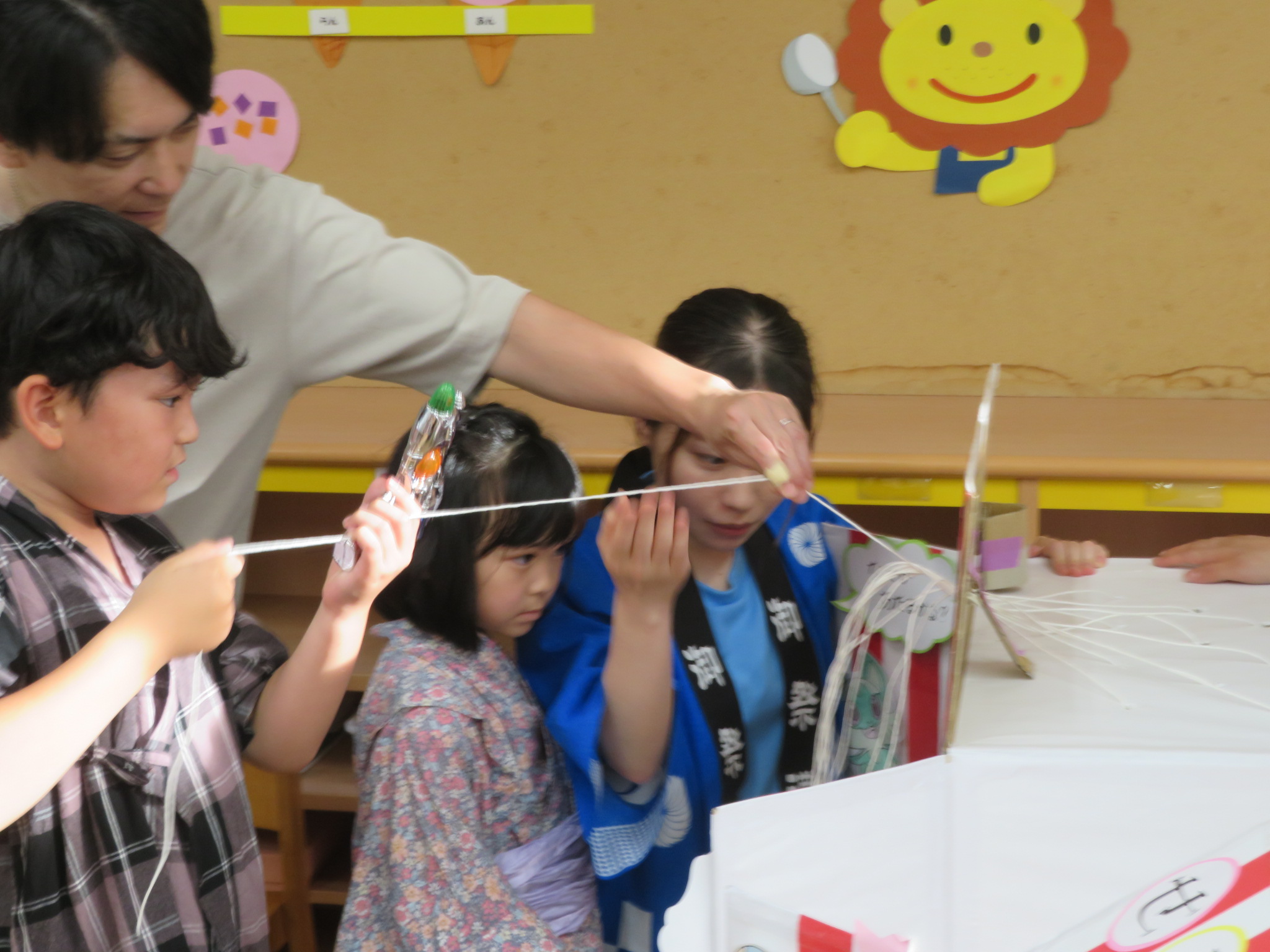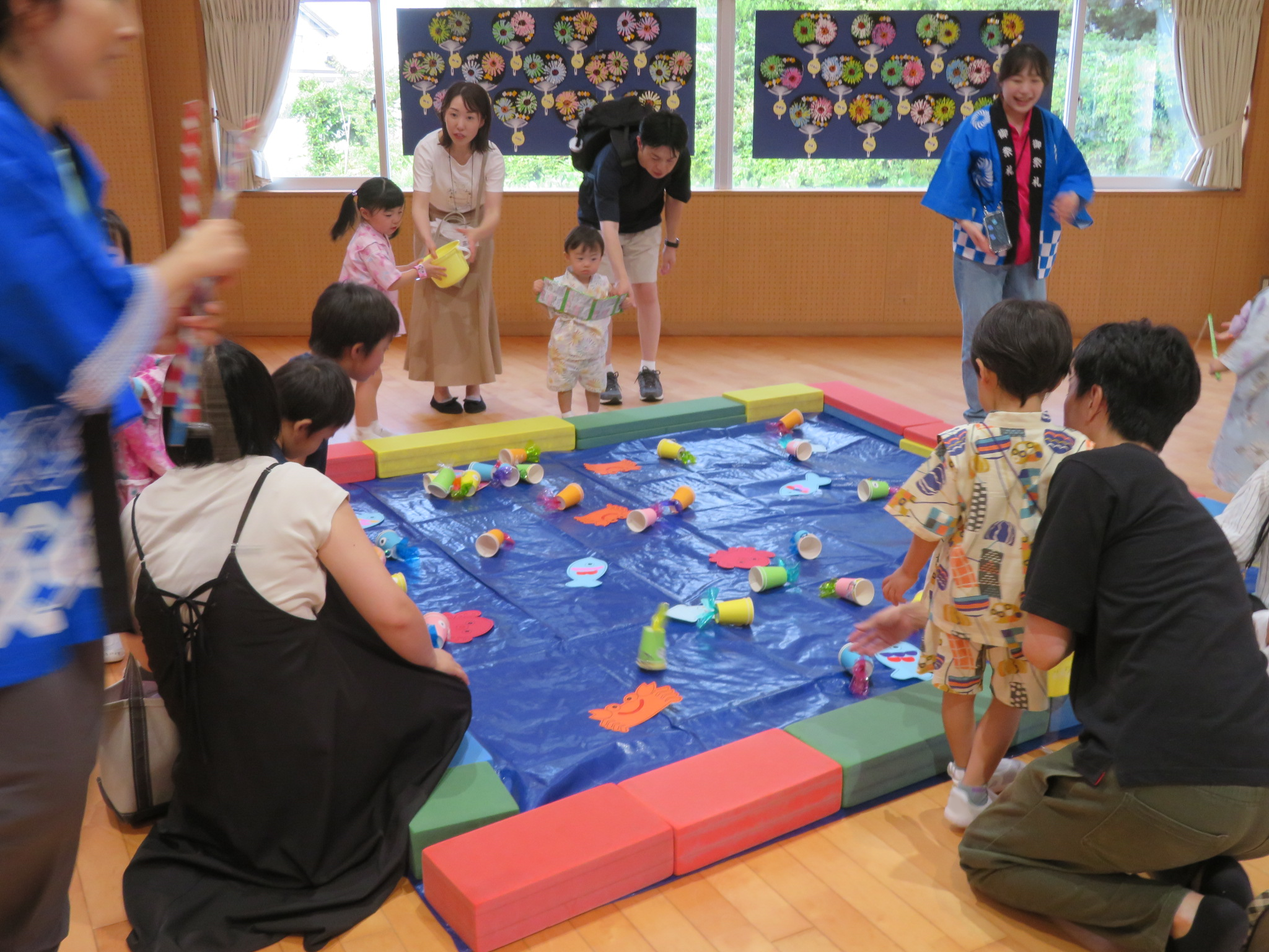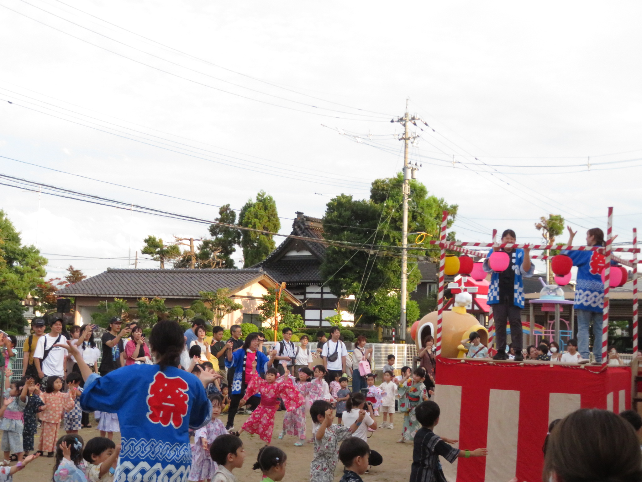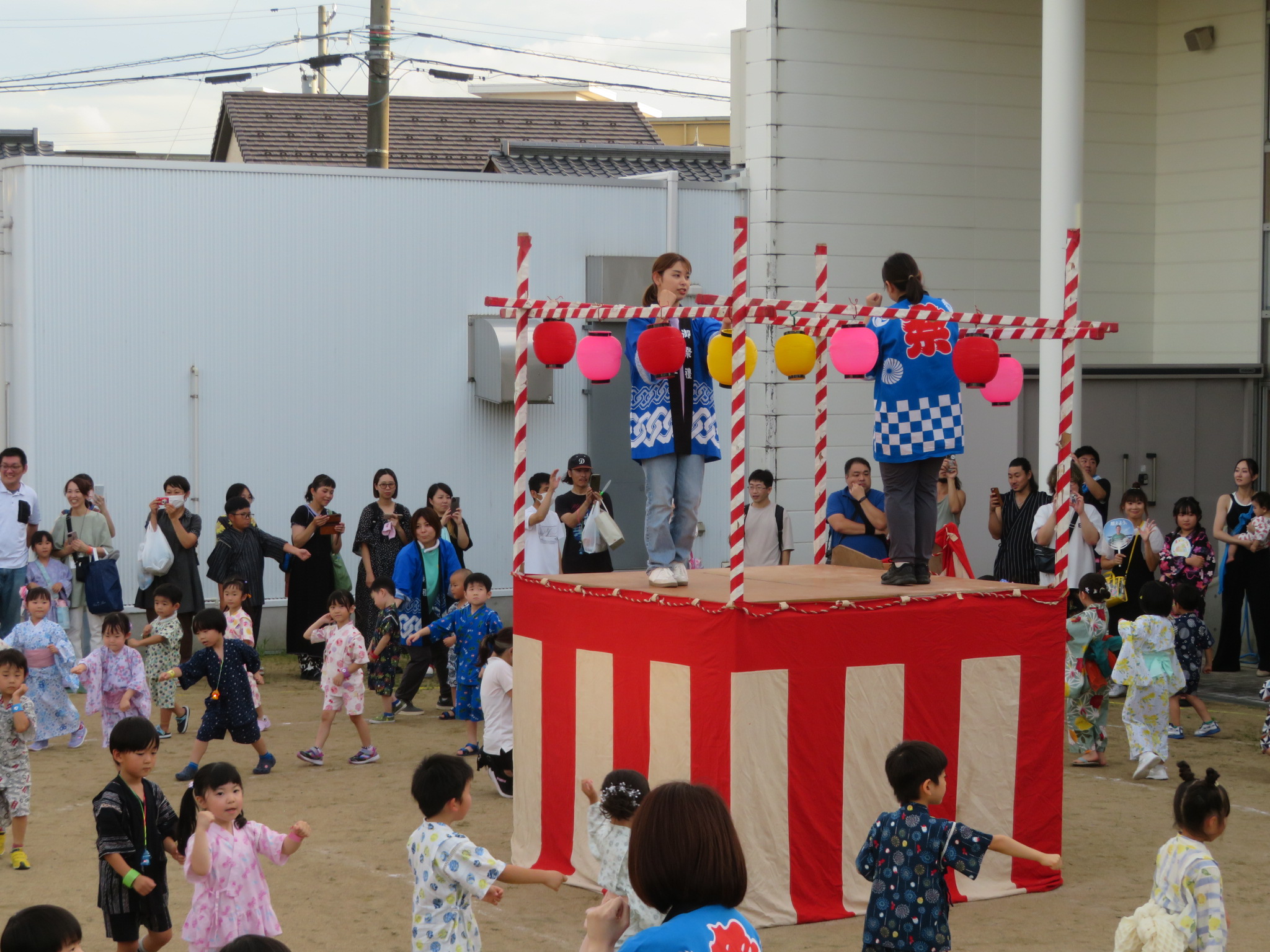 盆踊りを楽しみました! 2024/07/20 20日(土)は、楽しみにしていた盆踊り(^^)雨が心配されていましたが、お天気に恵まれ、浴衣や甚平をきて幼稚園に集合しました! 先生たちとゲームをしたり「アンパンマン音頭」「月夜のぽんちゃらりん」「お店屋さん音頭」を踊ったりと楽しい時間を過ごしました♪