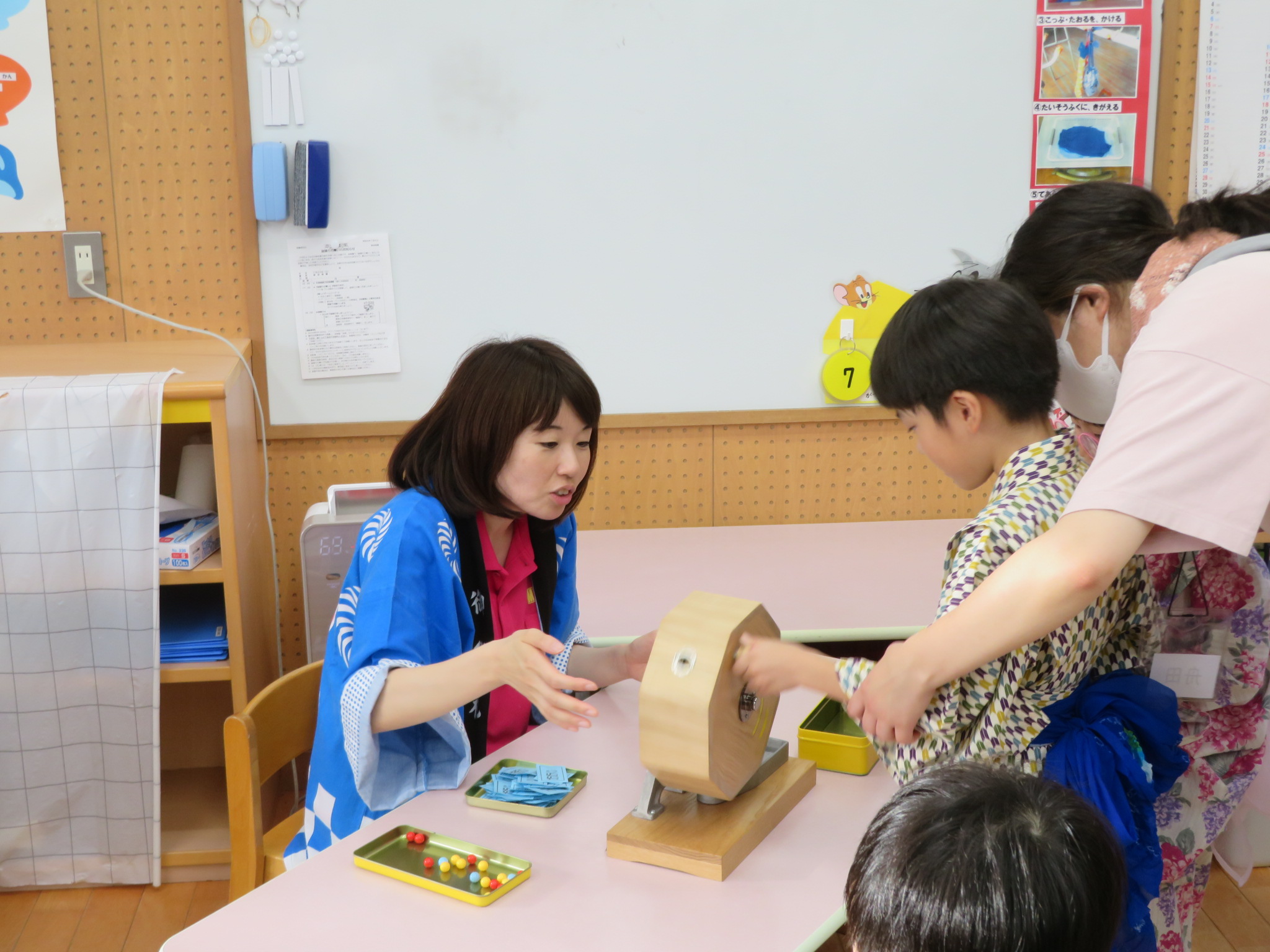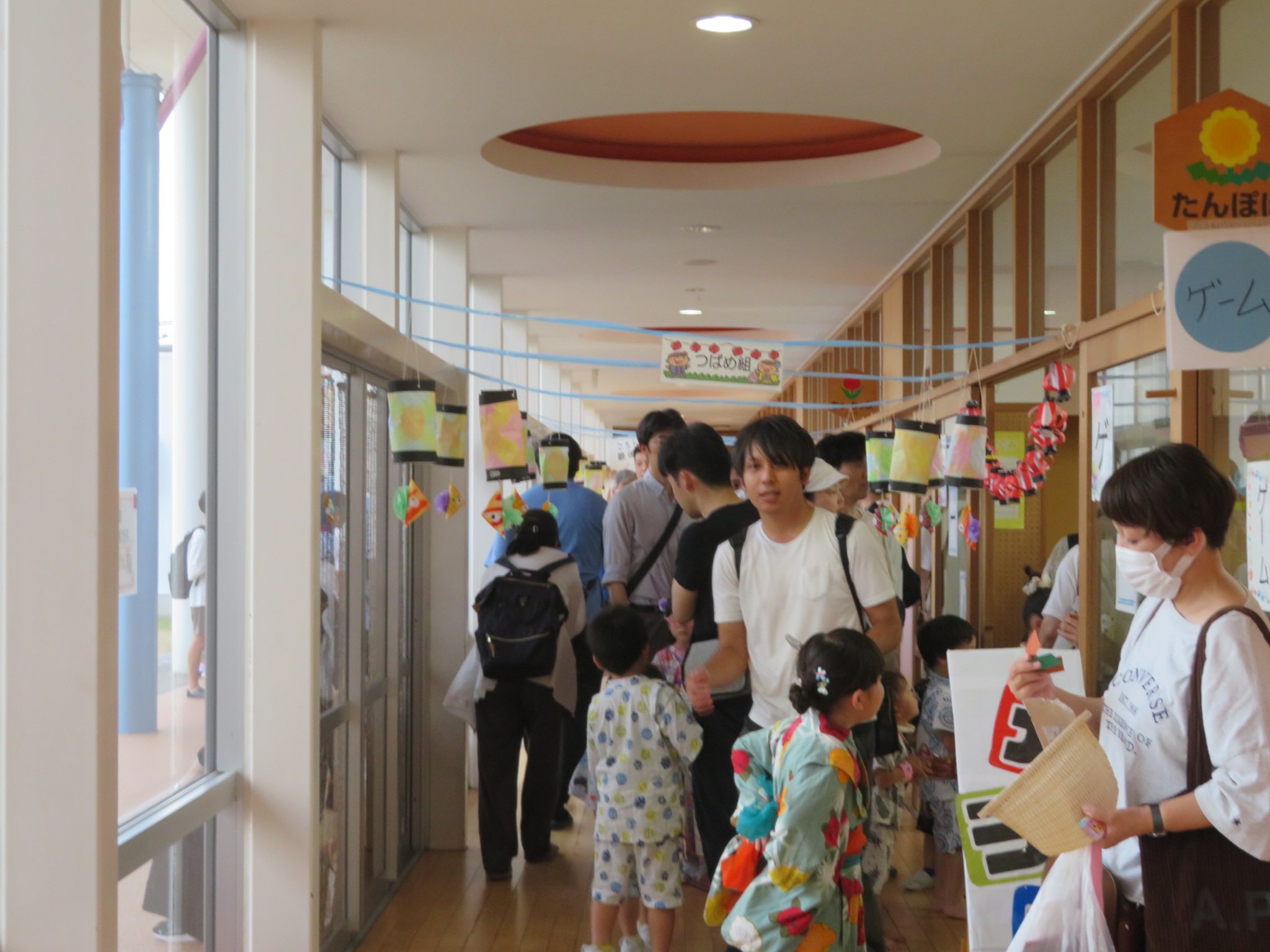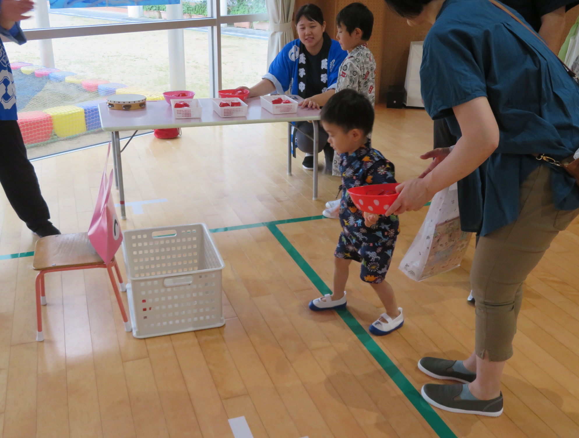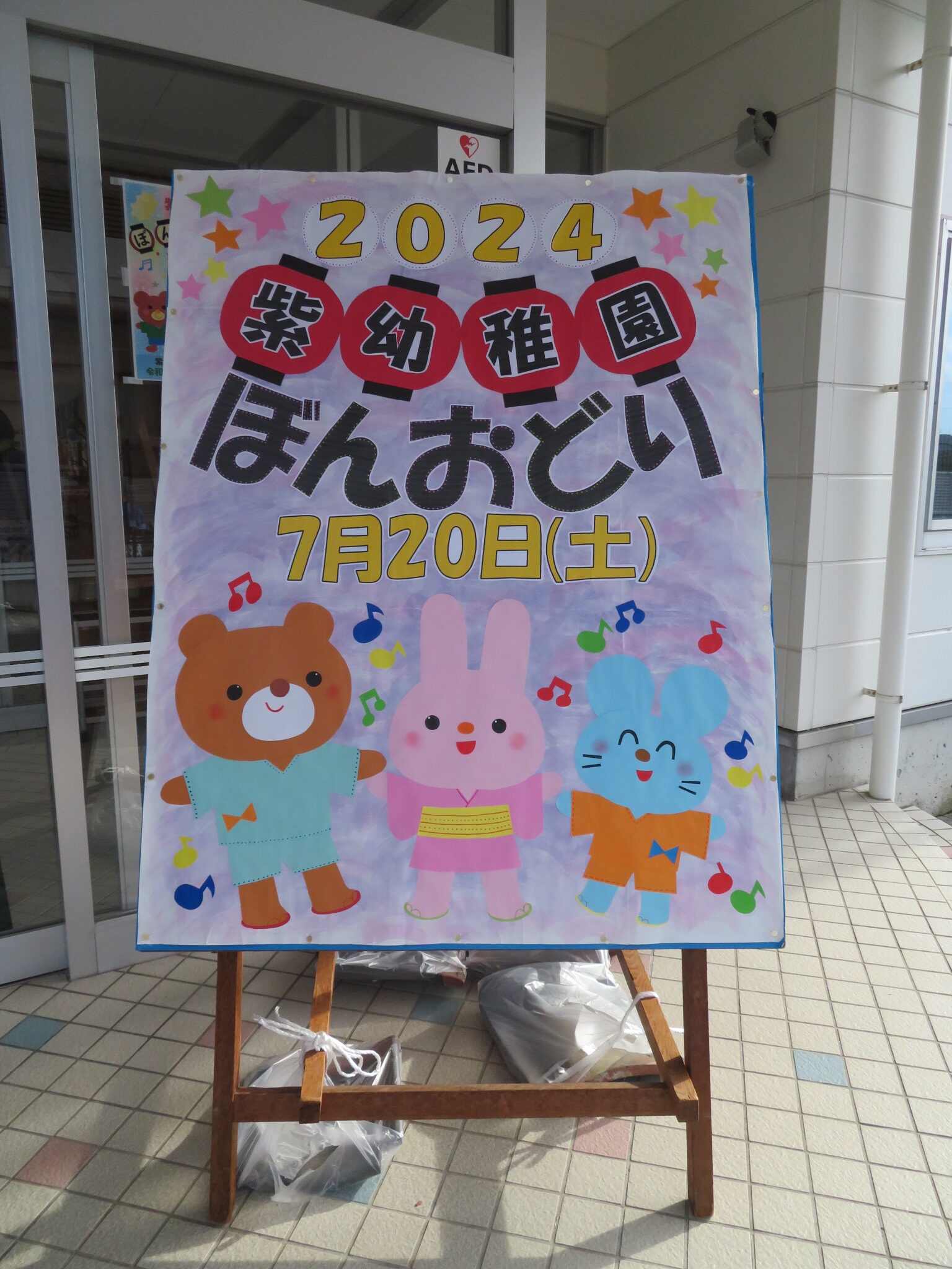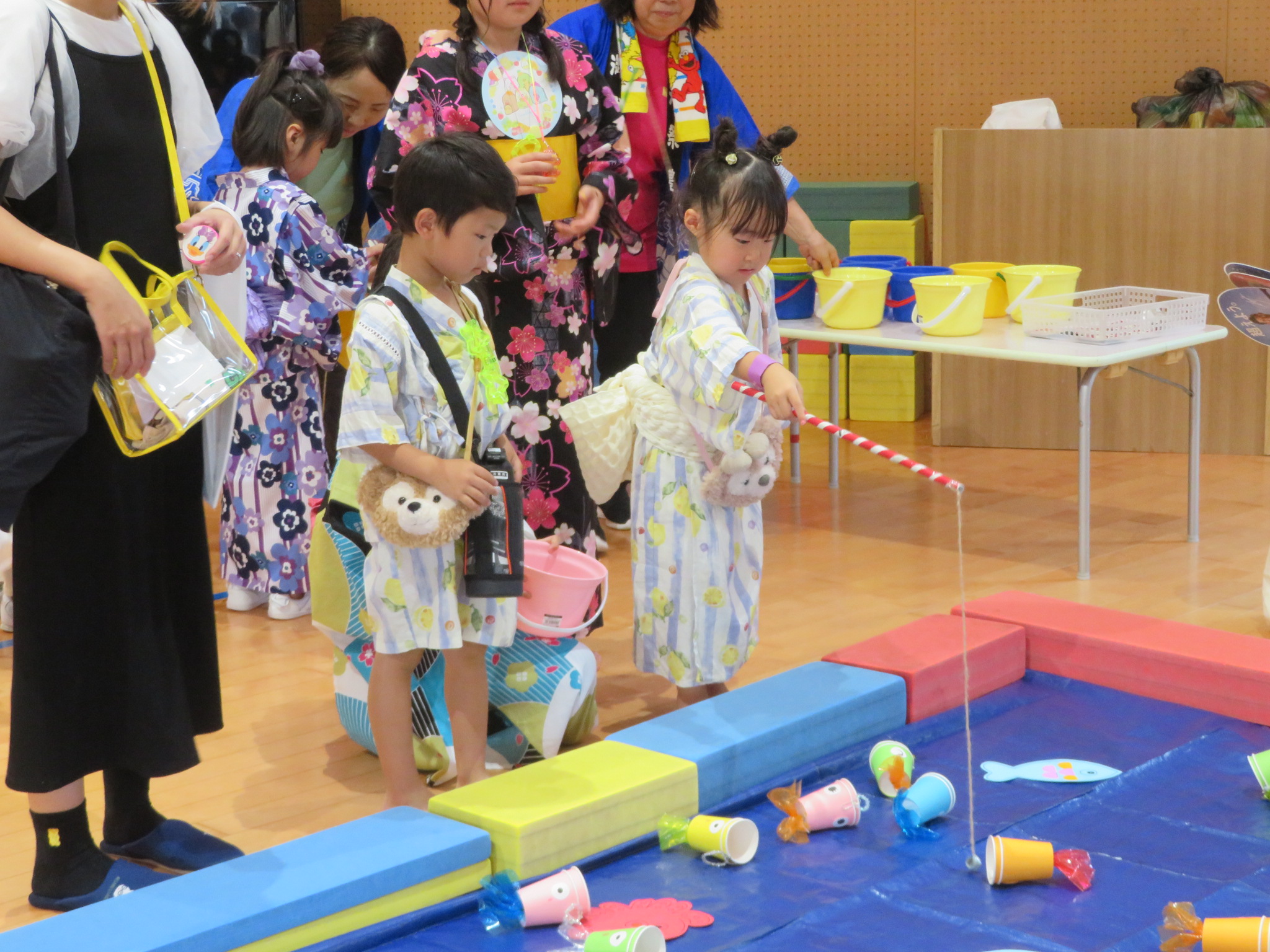 盆踊りを楽しみました! 2024/07/20 20日(土)は、楽しみにしていた盆踊り(^^)雨が心配されていましたが、お天気に恵まれ、浴衣や甚平をきて幼稚園に集合しました! 先生たちとゲームをしたり「アンパンマン音頭」「月夜のぽんちゃらりん」「お店屋さん音頭」を踊ったりと楽しい時間を過ごしました♪