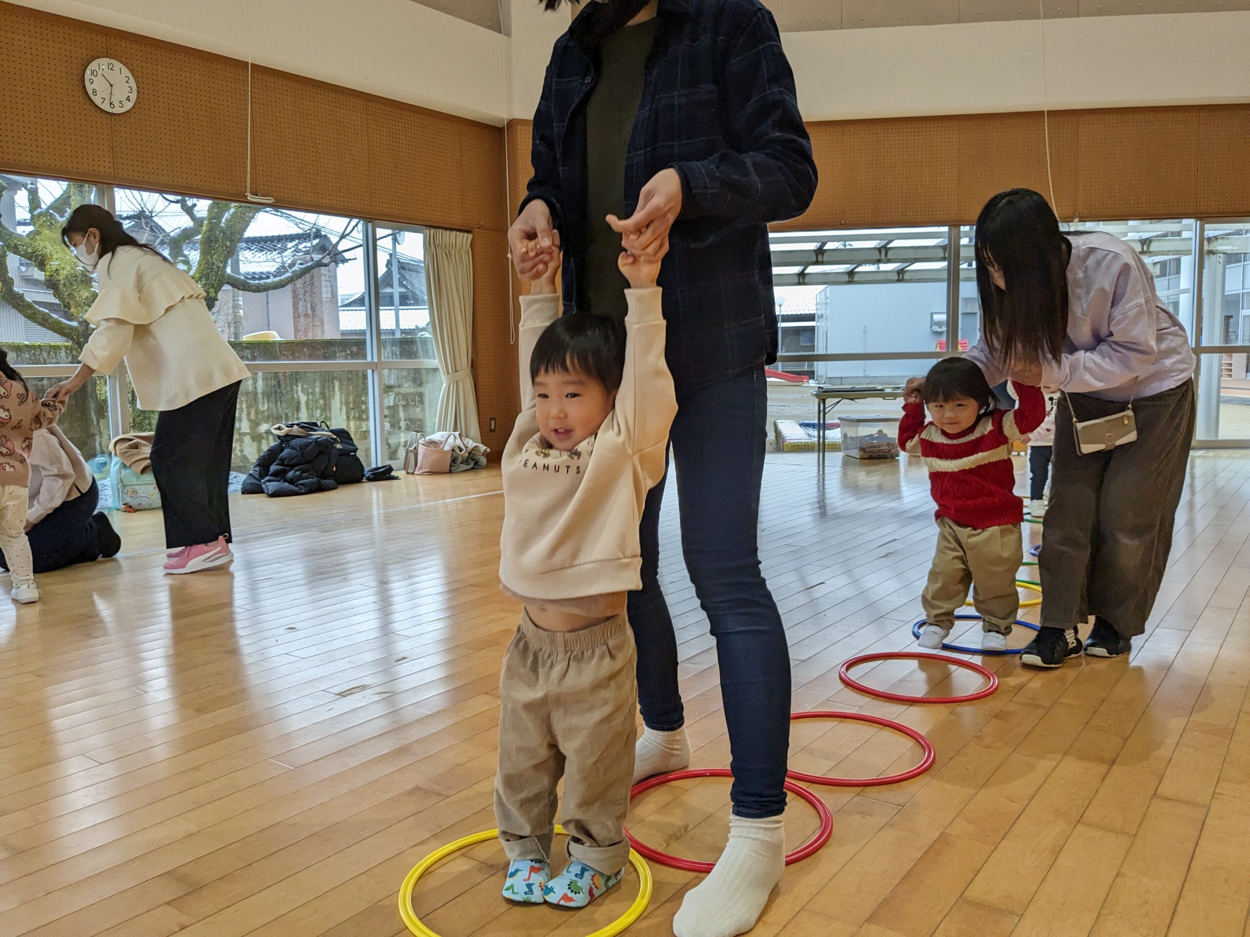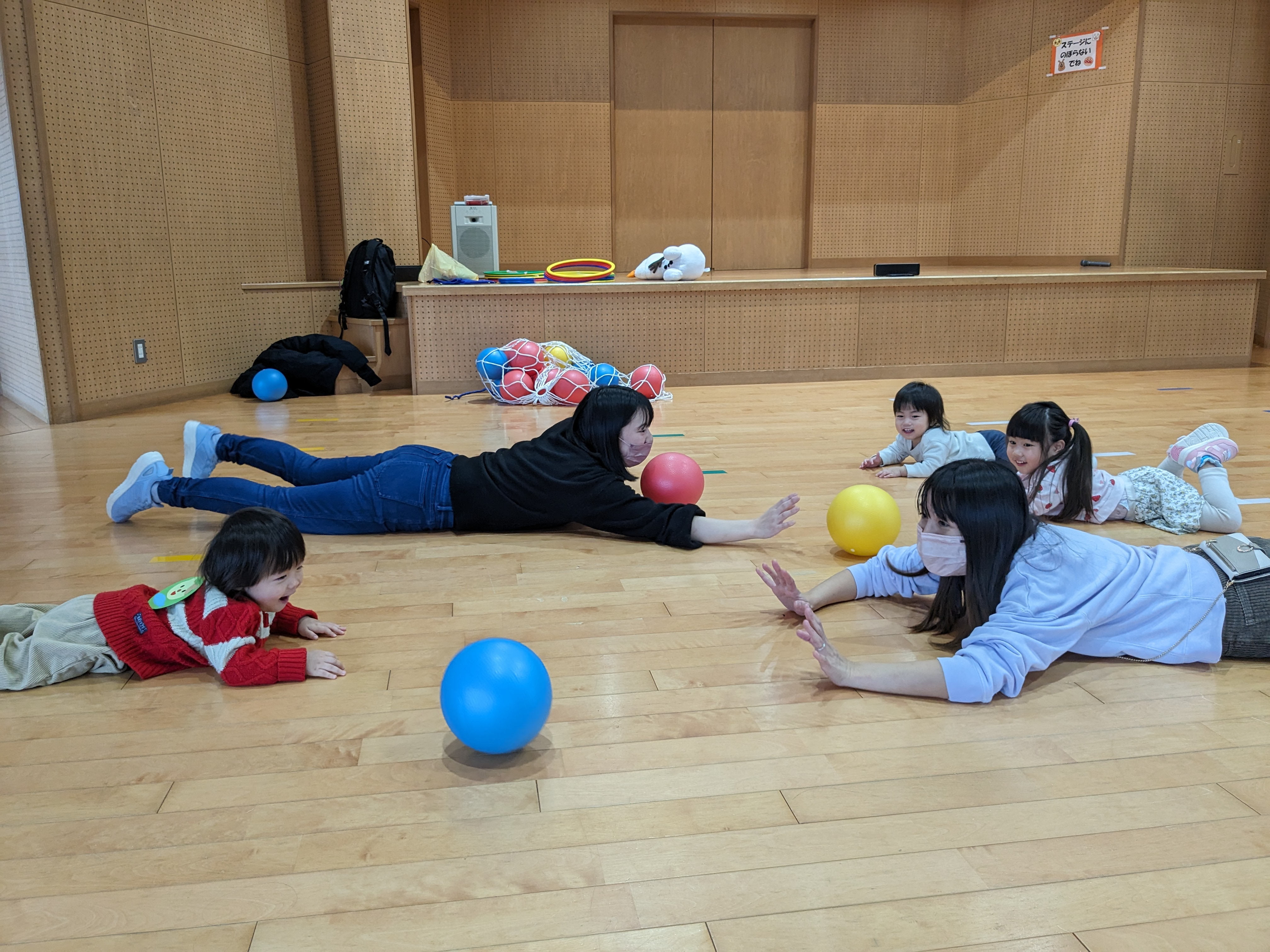 スキンシップを取りながら筋力アップの体操にチャレンジ!フープやボールでバランスアップの遊びにも挑戦して、親子でリフレッシュしました。