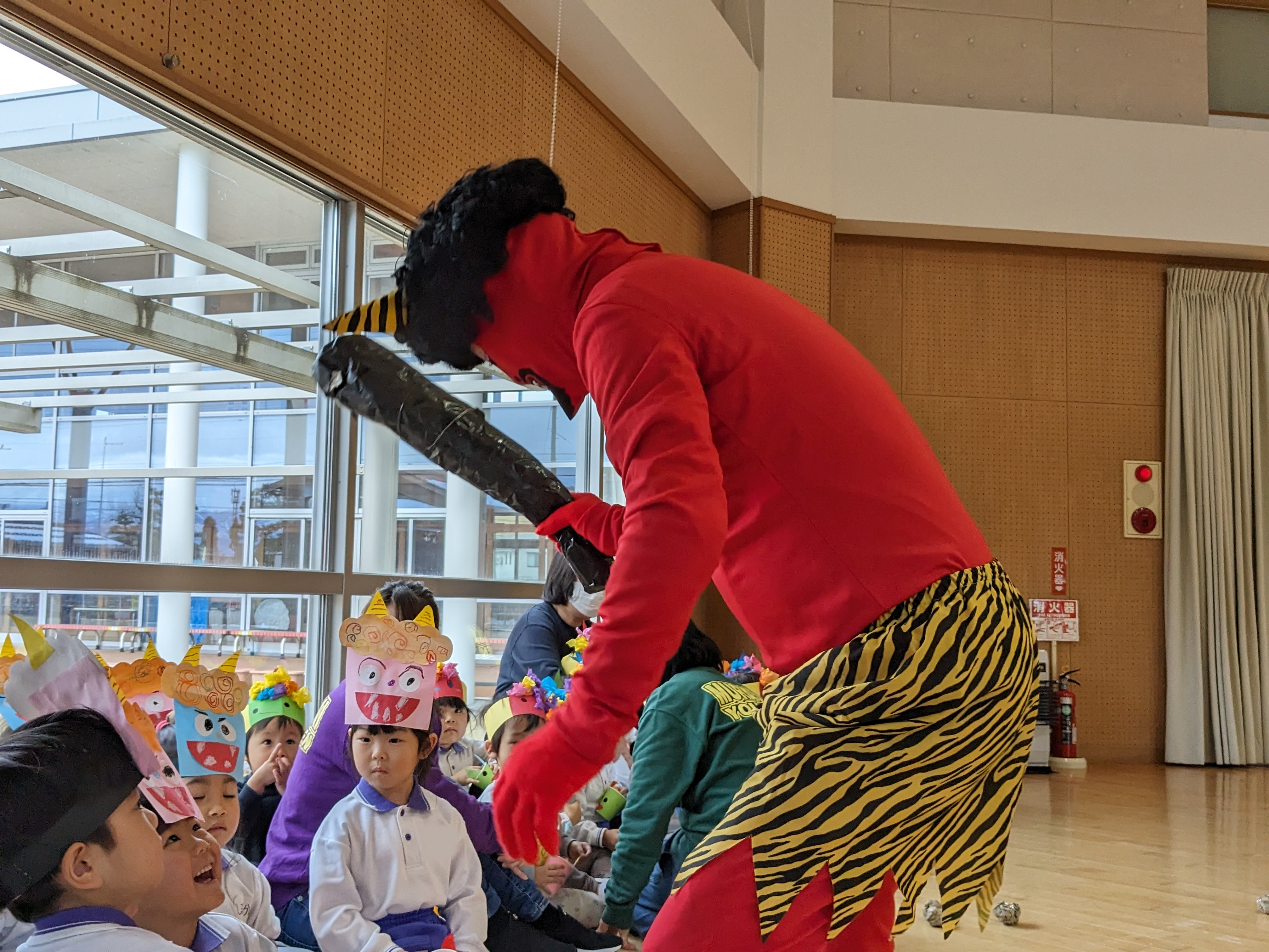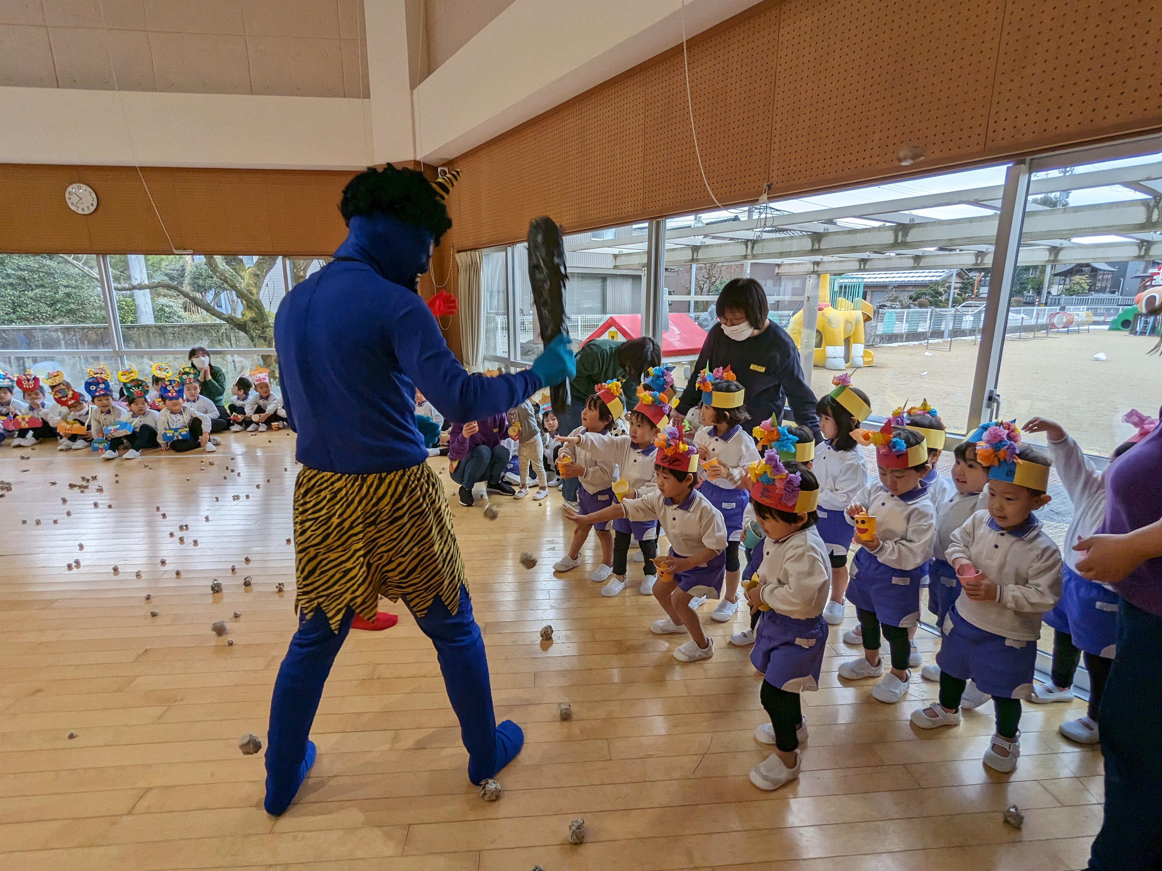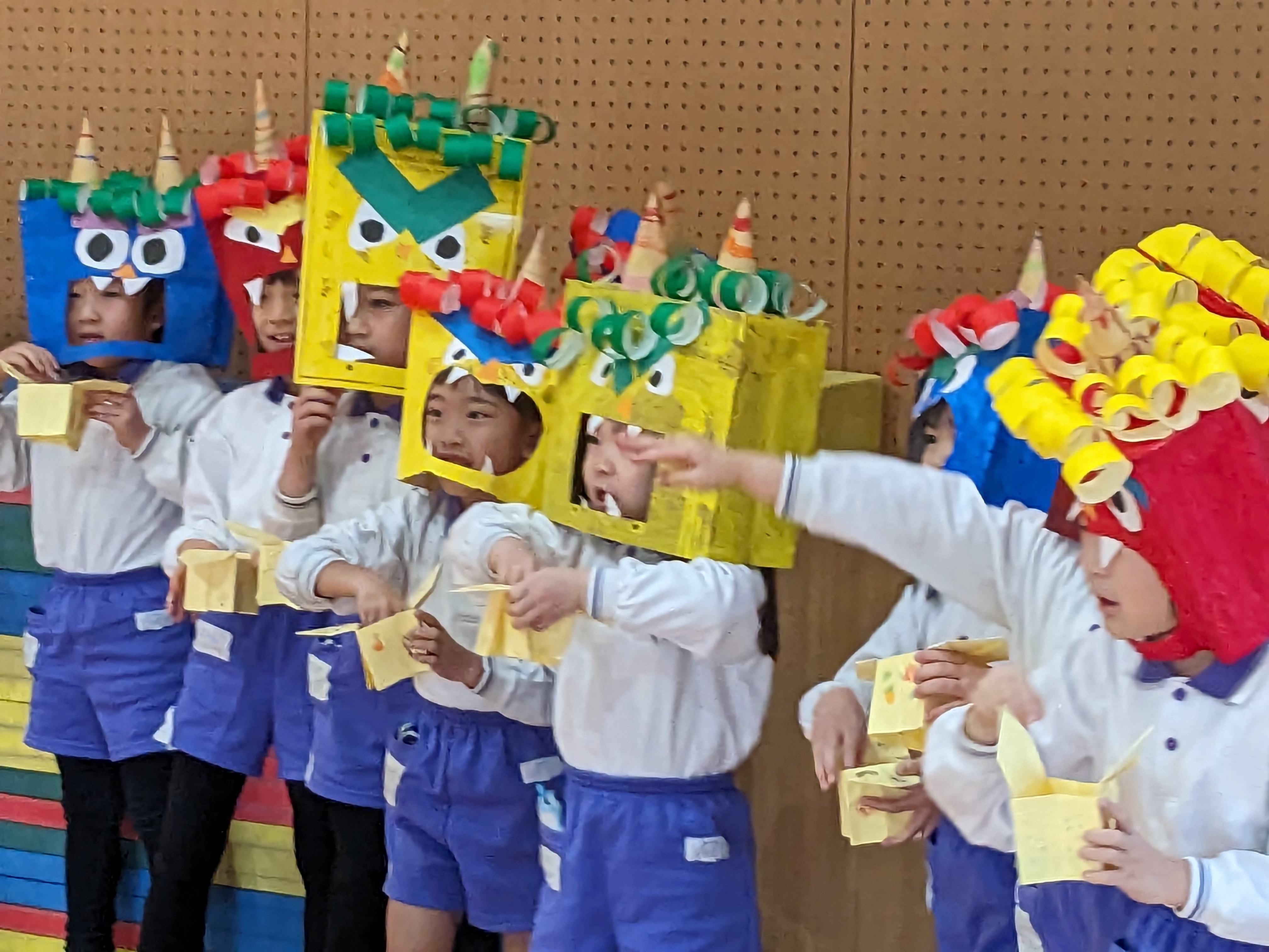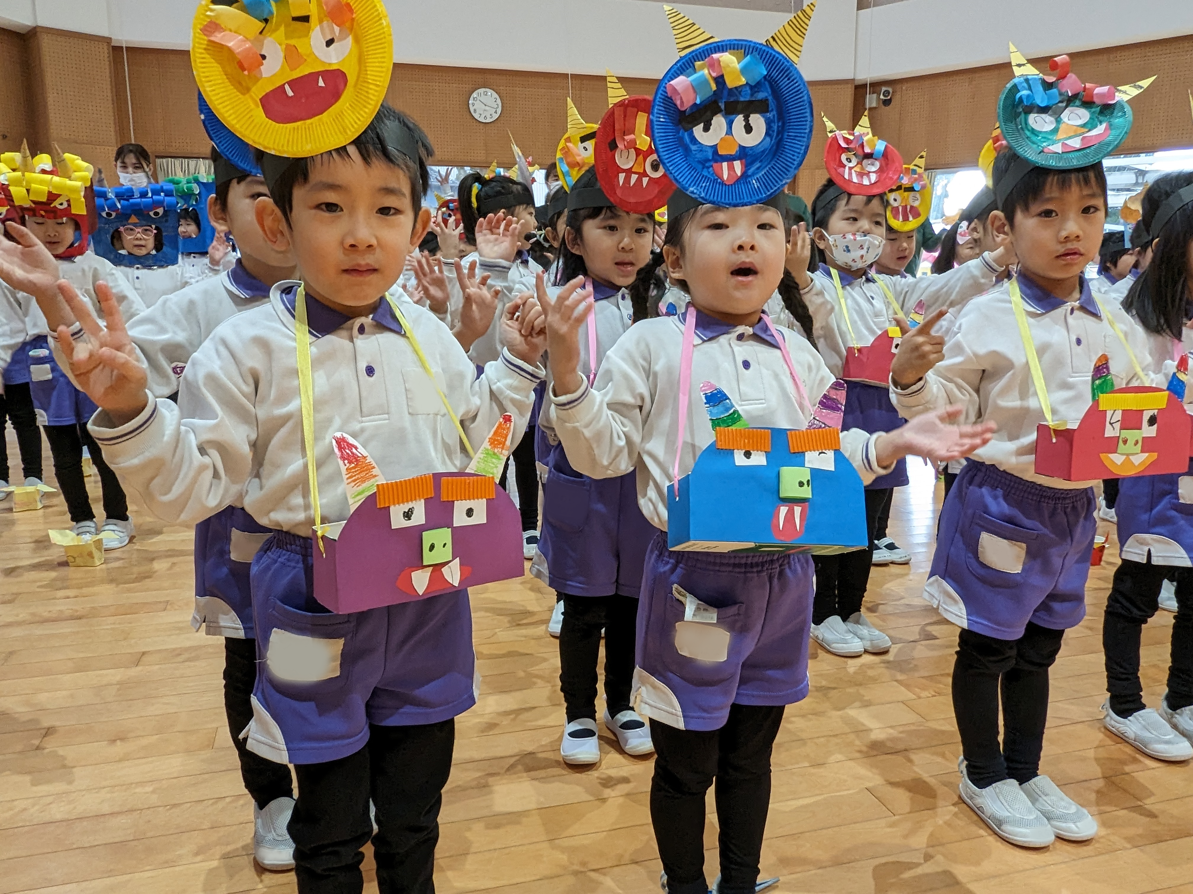 豆まき集会がありました! 2025/02/03 “節分クイズ”や“豆まきの歌”、大好きな“鬼のパンツ”の踊りを楽しみました!先生方の、鬼紹介をみて、「鬼は外!福は内!」の掛け声練習もして…いよいよ鬼の登場です!「みんなが幸せに健康で過ごせますように」と願いを込めて、元気いっぱいに豆まきをしました(^^)
