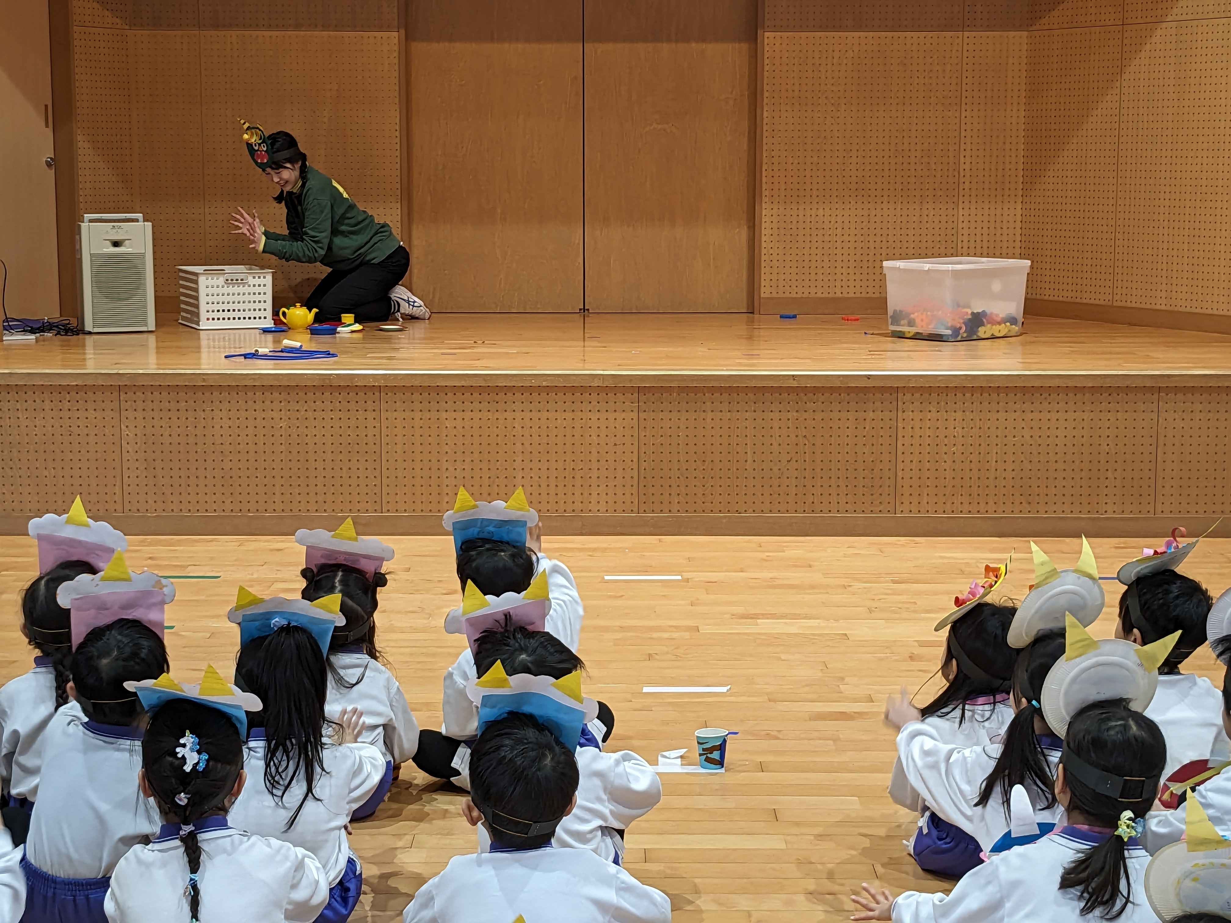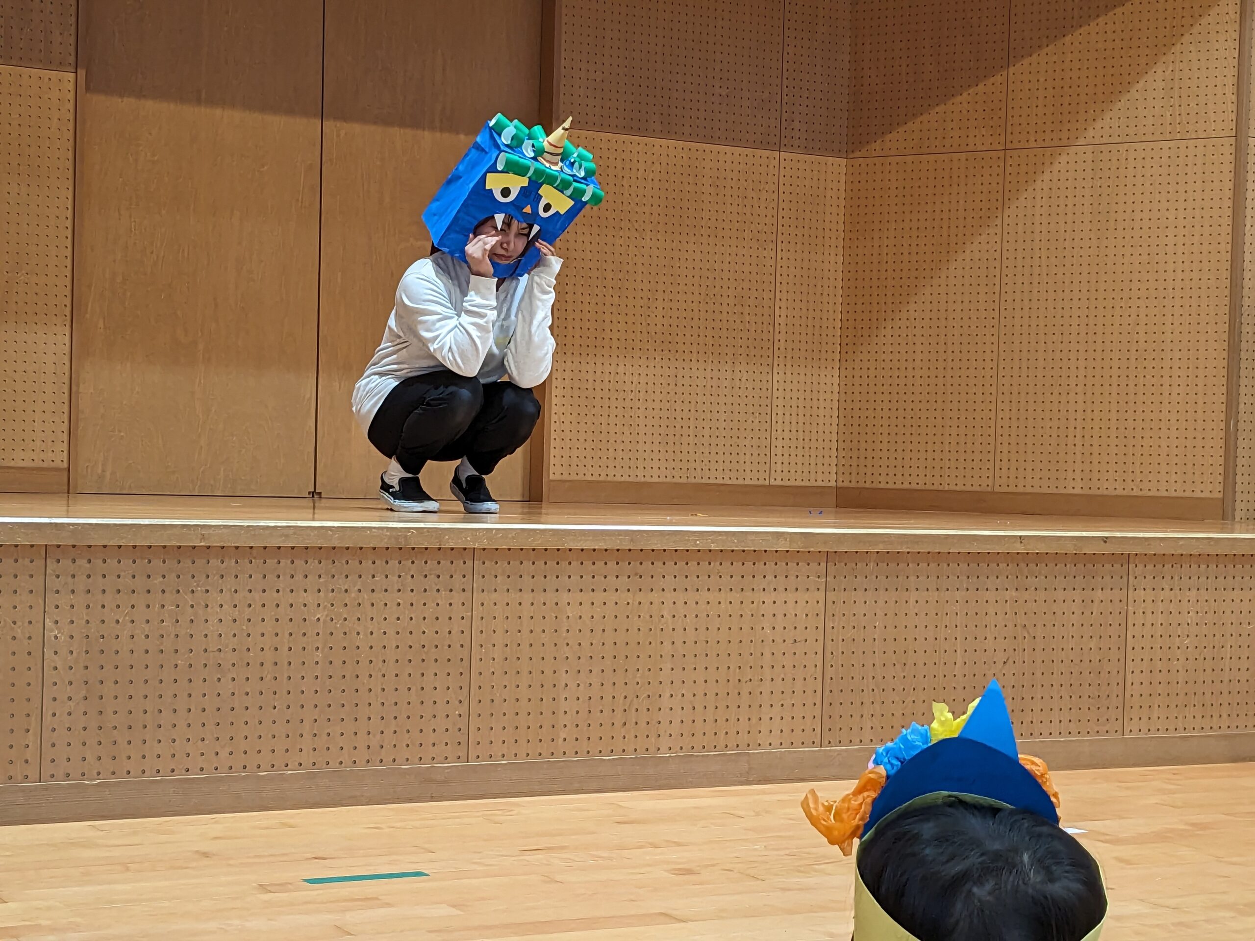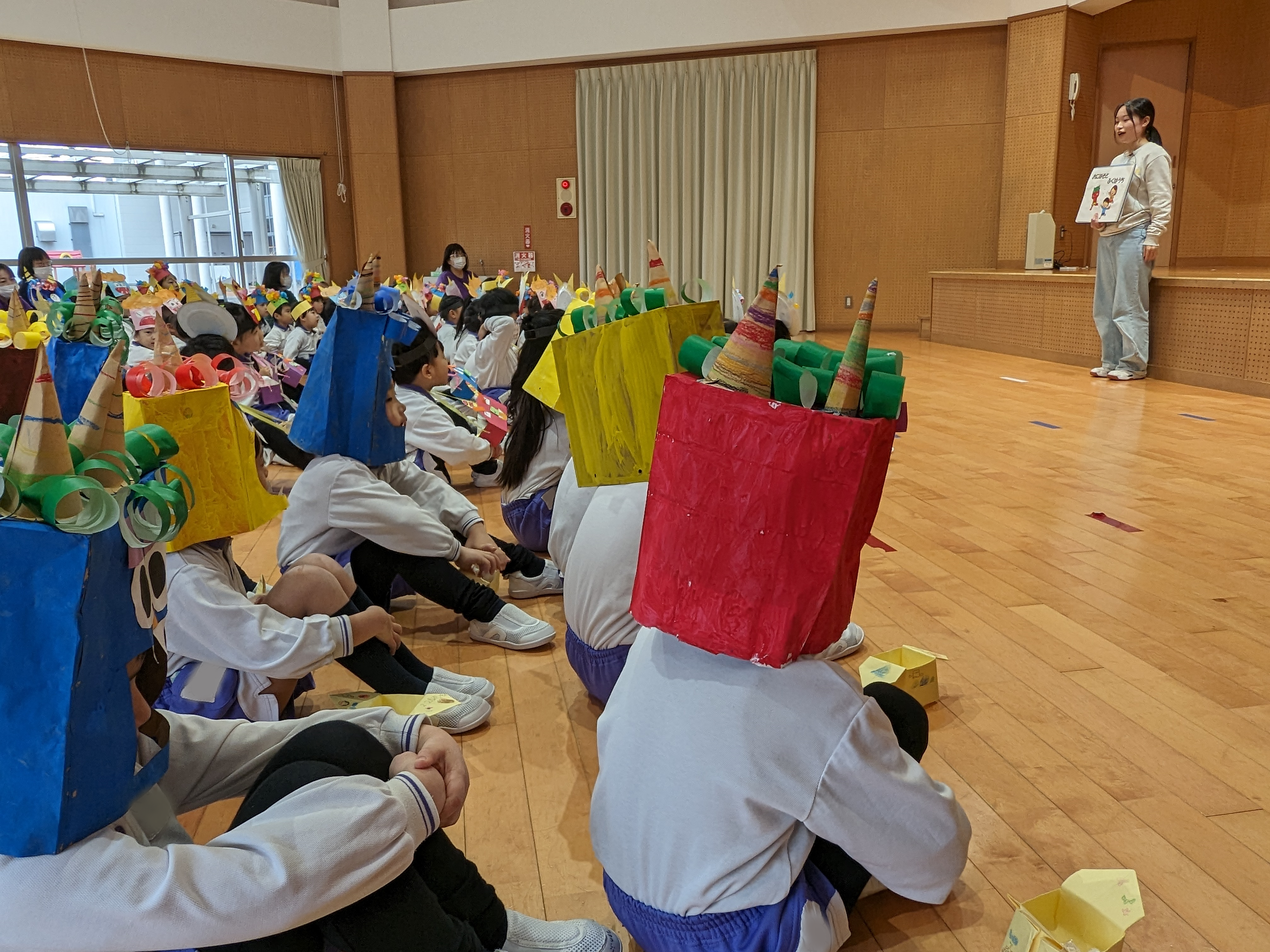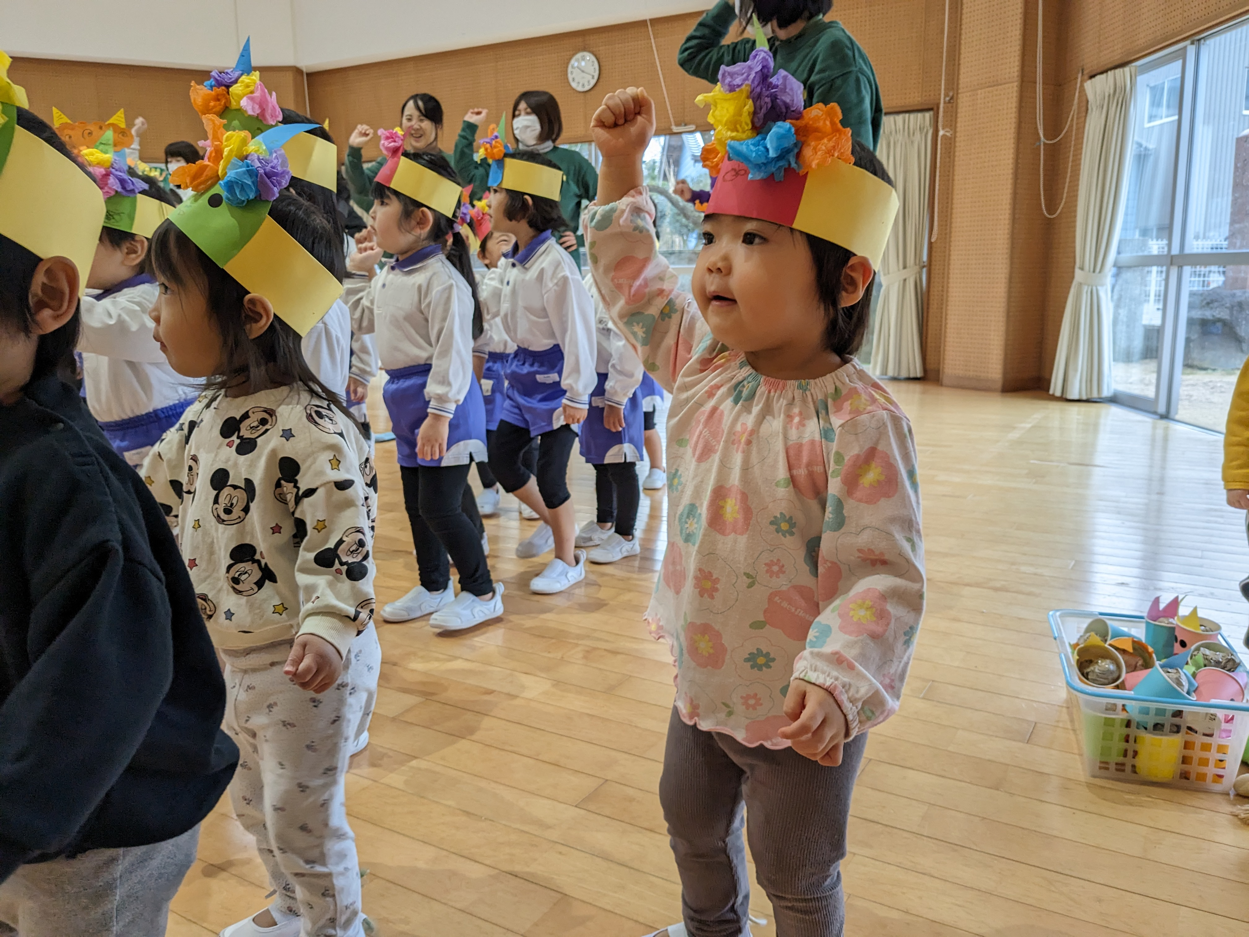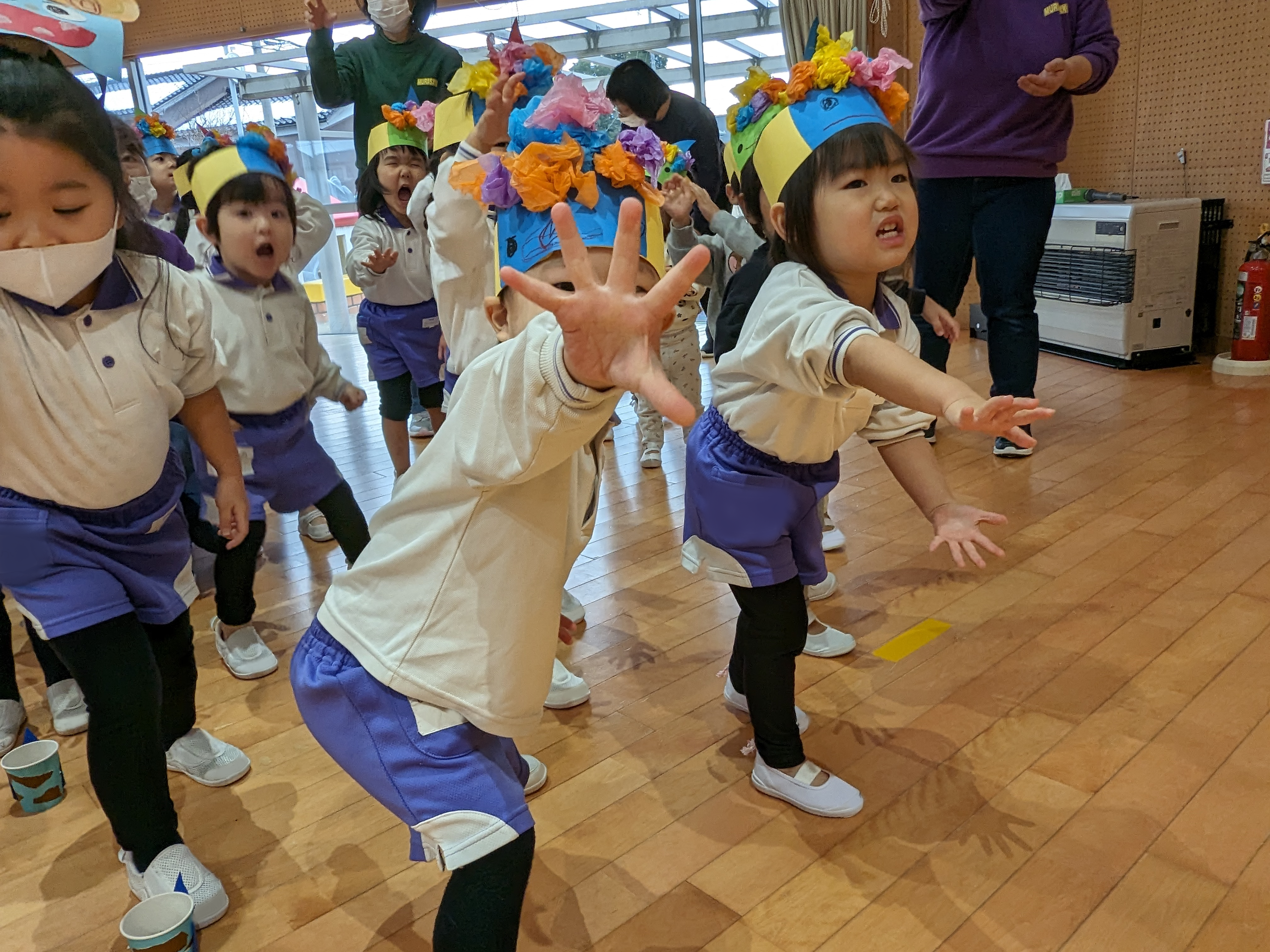豆まき集会がありました! 2025/02/03 “節分クイズ”や“豆まきの歌”、大好きな“鬼のパンツ”の踊りを楽しみました!先生方の、鬼紹介をみて、「鬼は外!福は内!」の掛け声練習もして…いよいよ鬼の登場です!「みんなが幸せに健康で過ごせますように」と願いを込めて、元気いっぱいに豆まきをしました(^^)