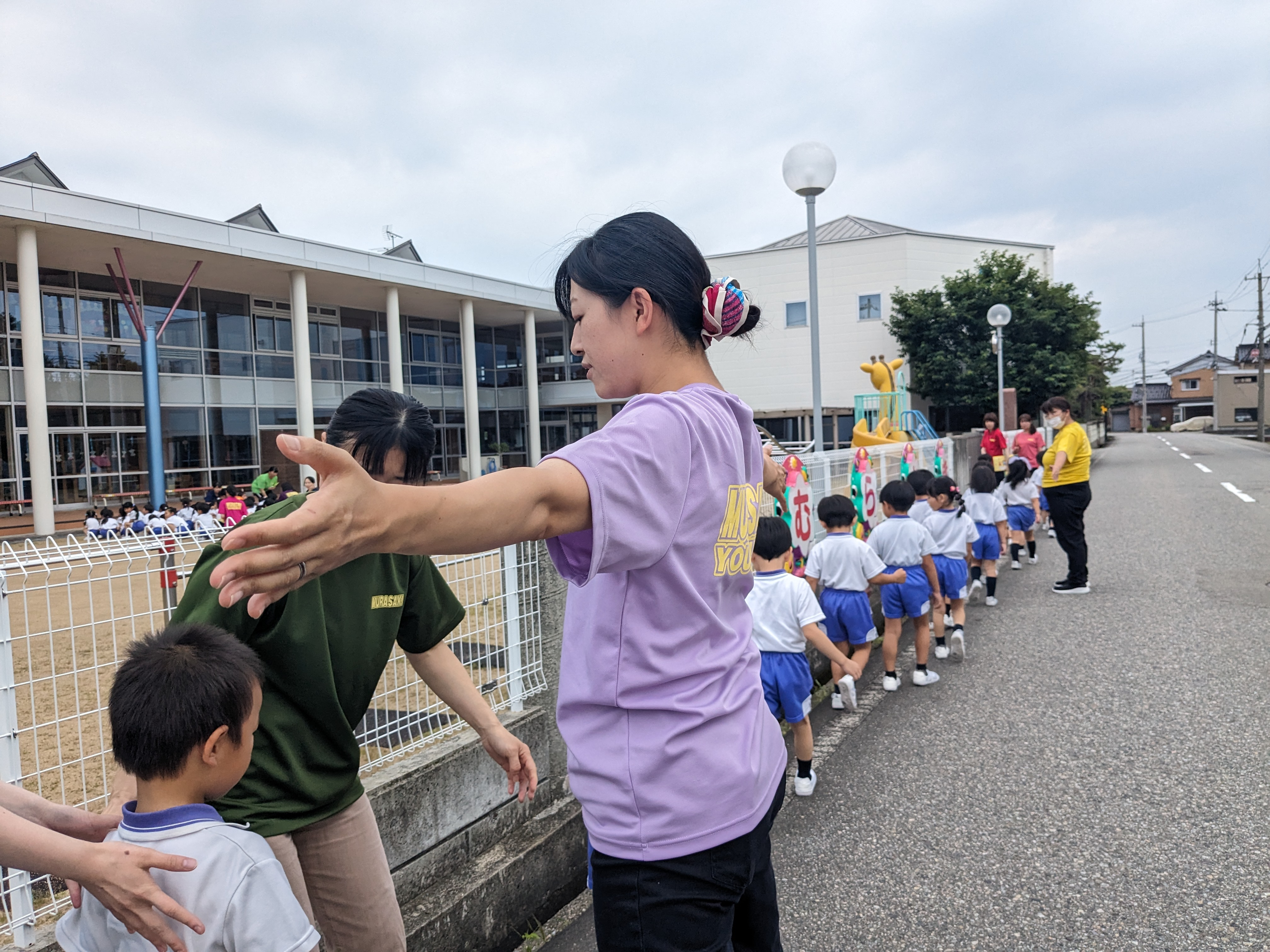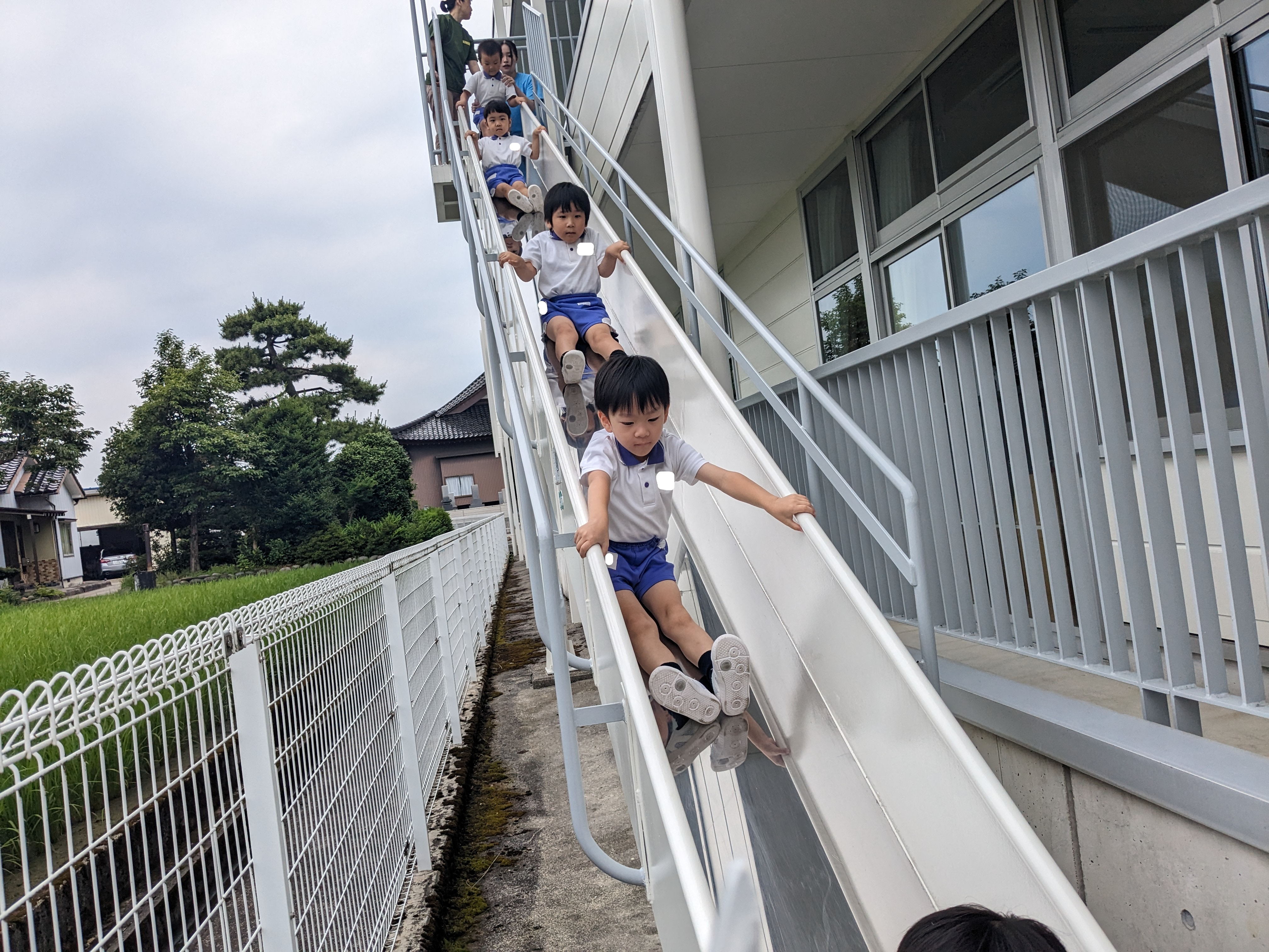 年長組・年中組は、非常すべり台を滑り避難場所に行きました。真剣な表情で訓練に参加をしていました。