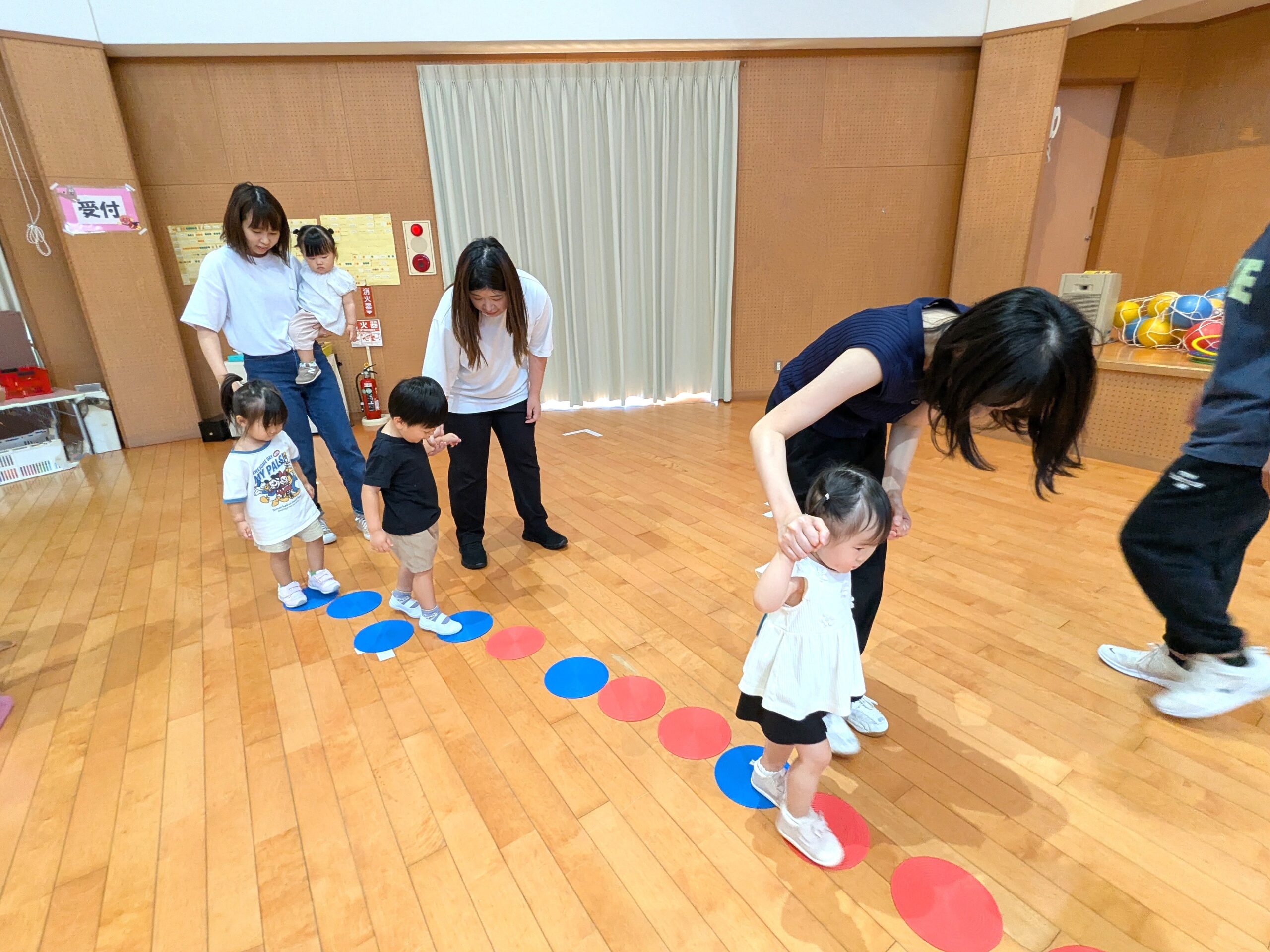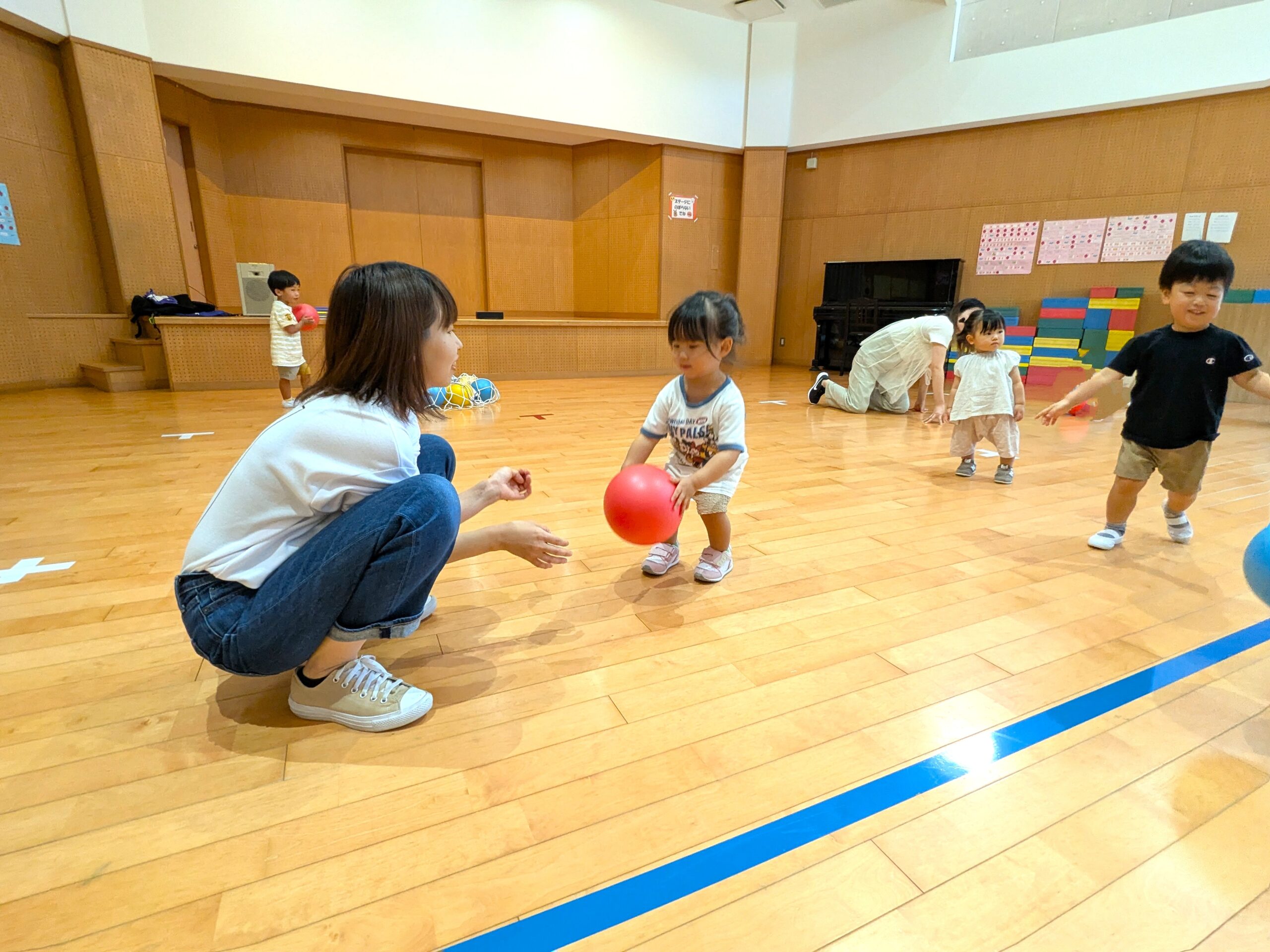 未就園児親子サークル・なかよしスクール 2025/09/02 講師の松井望美先生と一緒に、運動遊びをしました。お子さんが幼い時期に親子でふれあいながら楽しく体を動かした経験や、褒められた経験はとても大切です。成長にともない、苦手意識をもたずに色々な運動を楽しめるようになるそうです。今日は、ボールやフープを使い親子で運動遊びを楽しみました♪
