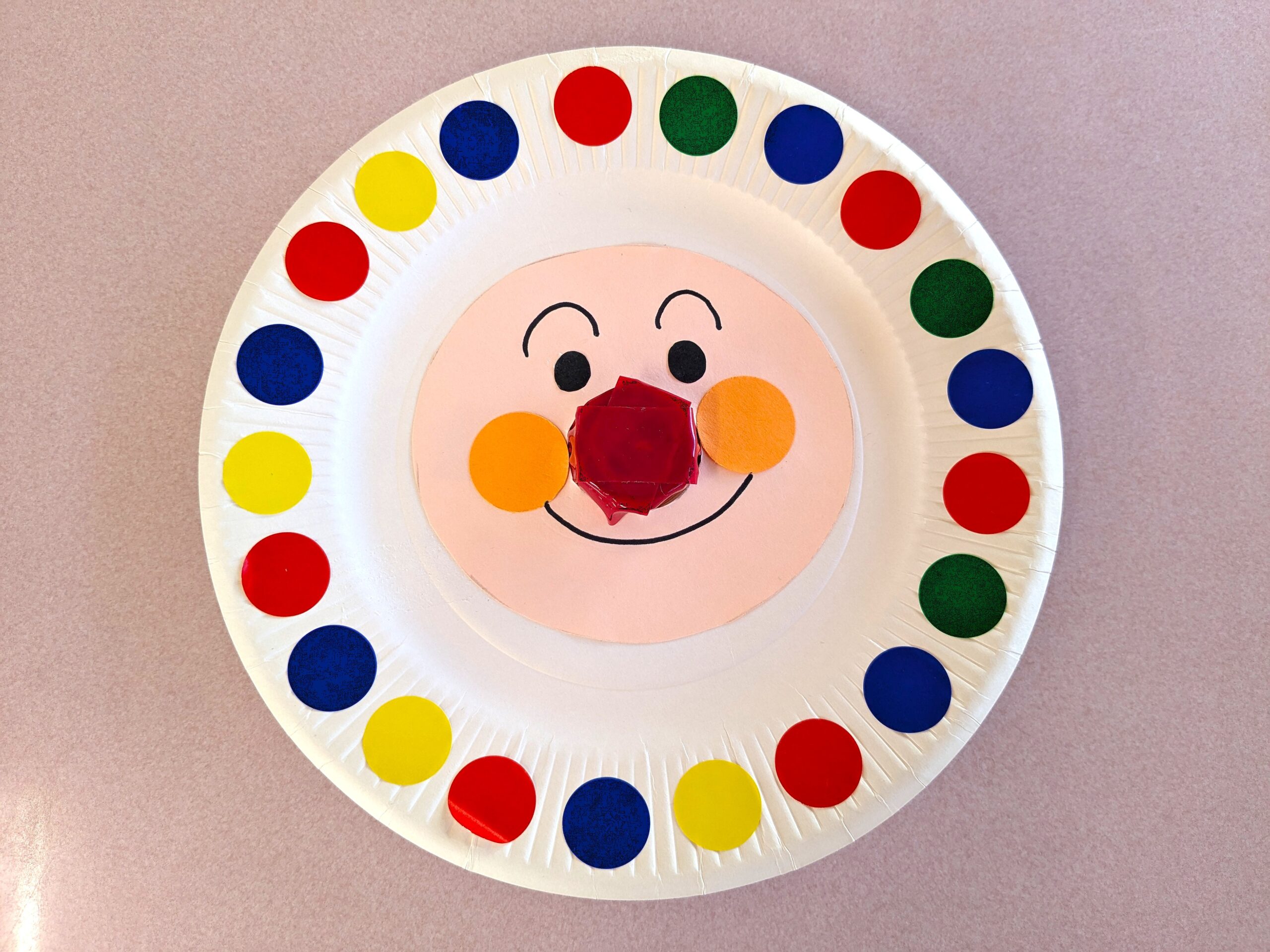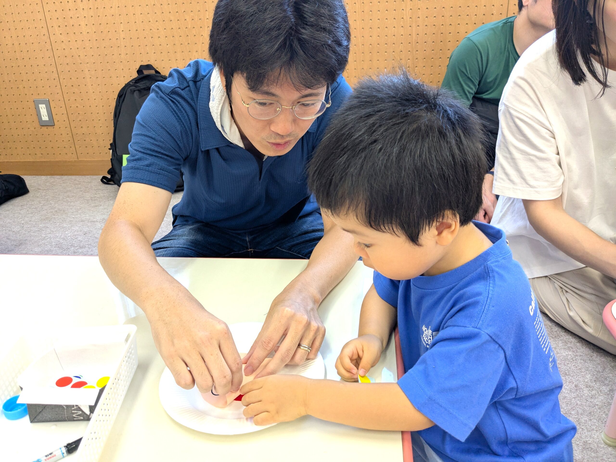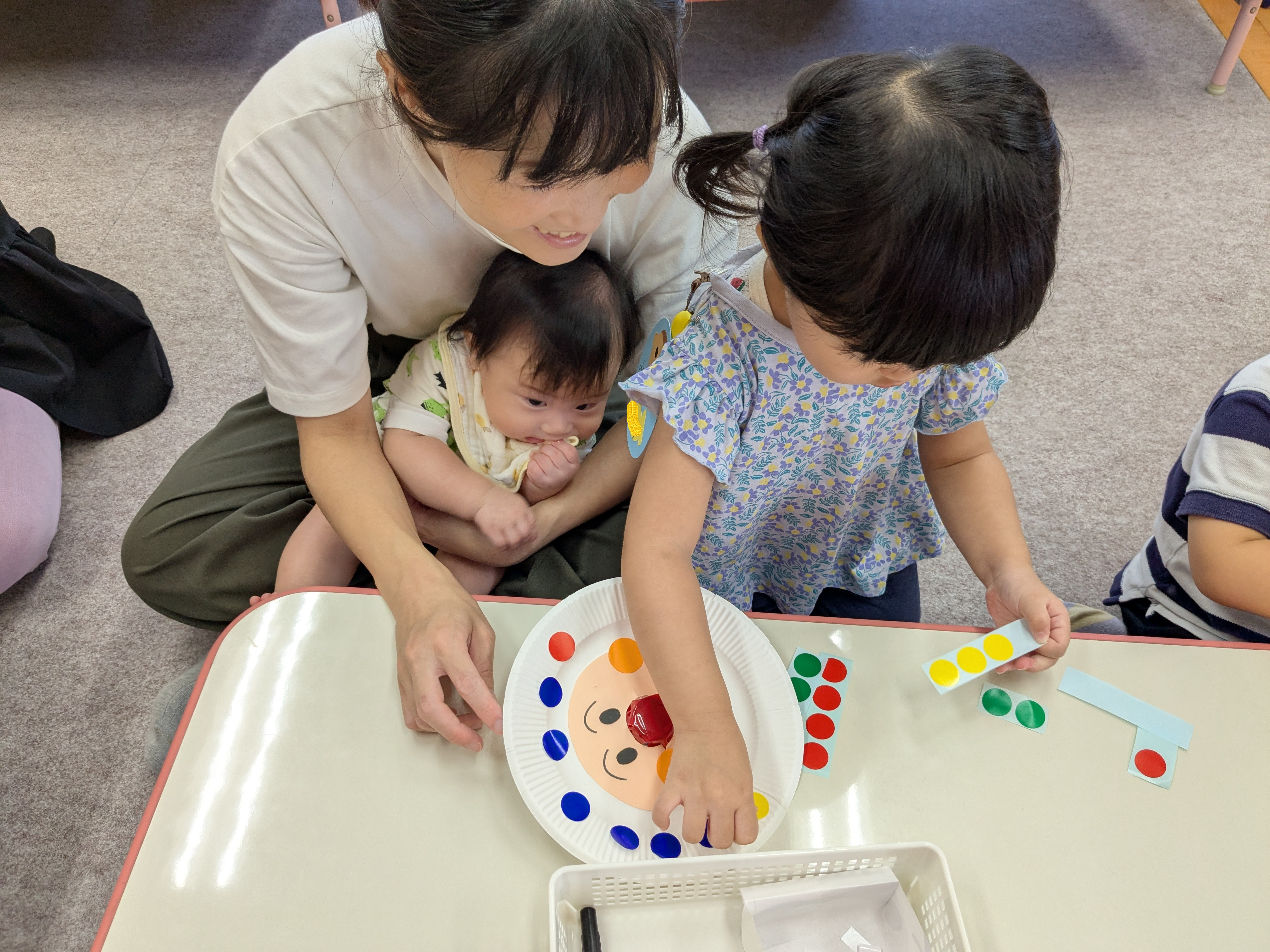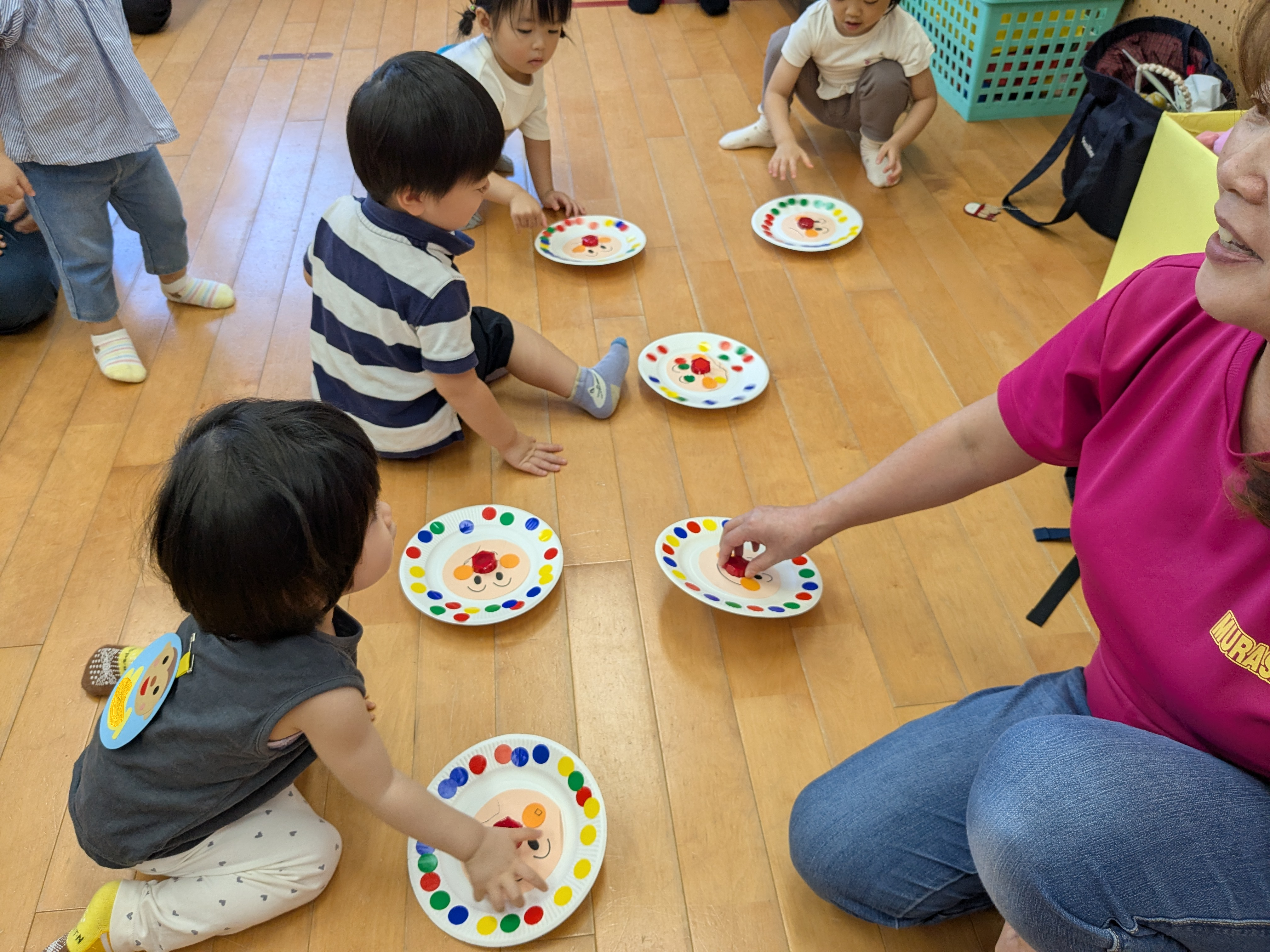 未就園児親子サークル・なかよしスクール 2025/09/16 身近な廃材を利用して、遊べる玩具を作りたいと思い、アンパンマンのコマ作りをしました。お家の方と一緒にシールを貼り、とても素敵にできあがりました!アンパンマンの鼻はペットボトルの蓋です。そこを指でつまんでまわすと、小さなお子さんの手でもクルクルとまわります!とても、うれしそうな子ども達でした。