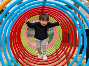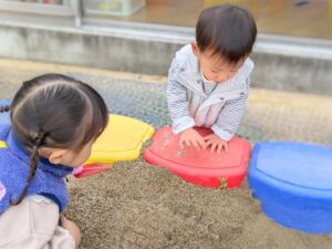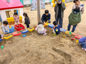 未就園児親子サークル・なかよしスクール 2025/10/24 くもり空で雨が降らないか心配をしていましたが、小さなかわいい子ども達の願いが届き、幼稚園の園庭でみんなで遊ぶことができました。砂場でカエルを発見したり、お家の人にお手伝いをしてもらいながら三輪車に乗ったりしました。あこがれのアンパンマンのすべり台や砂場で遊ぶことができて、とてもうれしそうでした!
