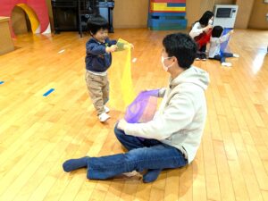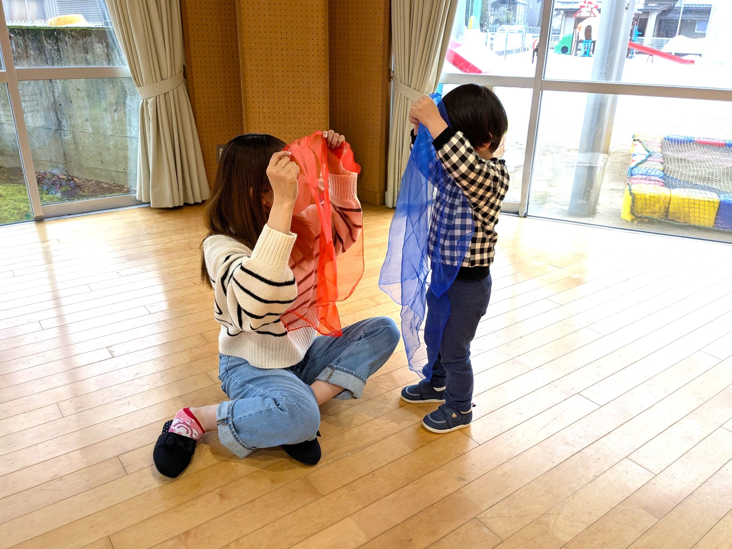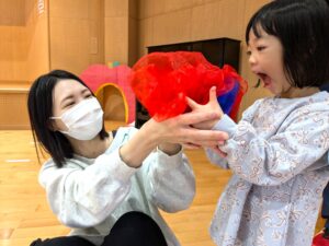未就園児親子サークル・なかよしスクール 2026/02/10 幼稚園専属講師、矢木和代先生と一緒にリトミックをしました。遊びの中で自然に音楽を感じ親しみを持つことをねらいに、親子で表現遊びを楽しみました。音の強弱に合わせて返事をしたり、スカーフを使ったふれあい遊びをしたりと、笑顔があふれる時間を過ごしました。