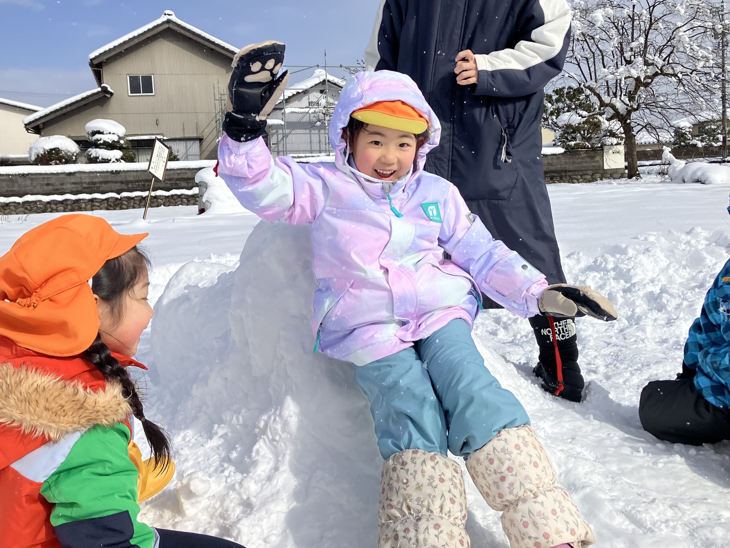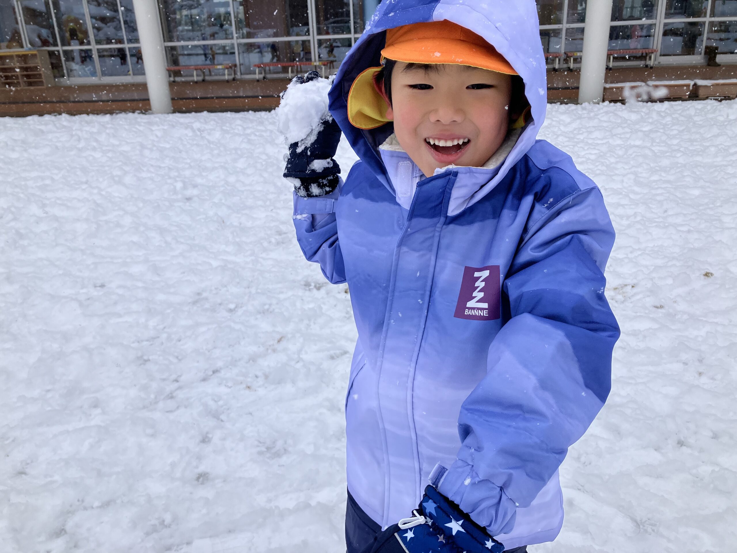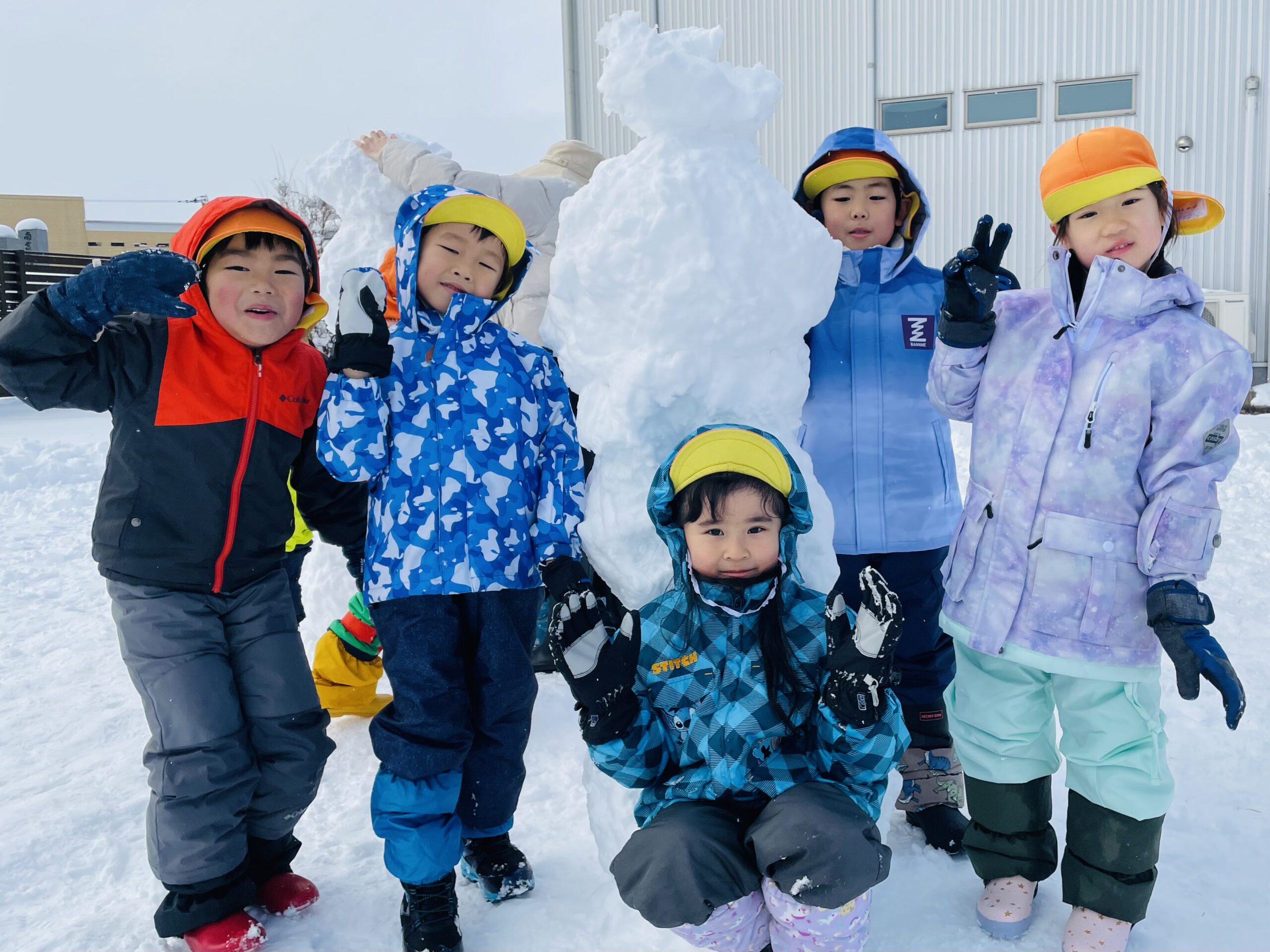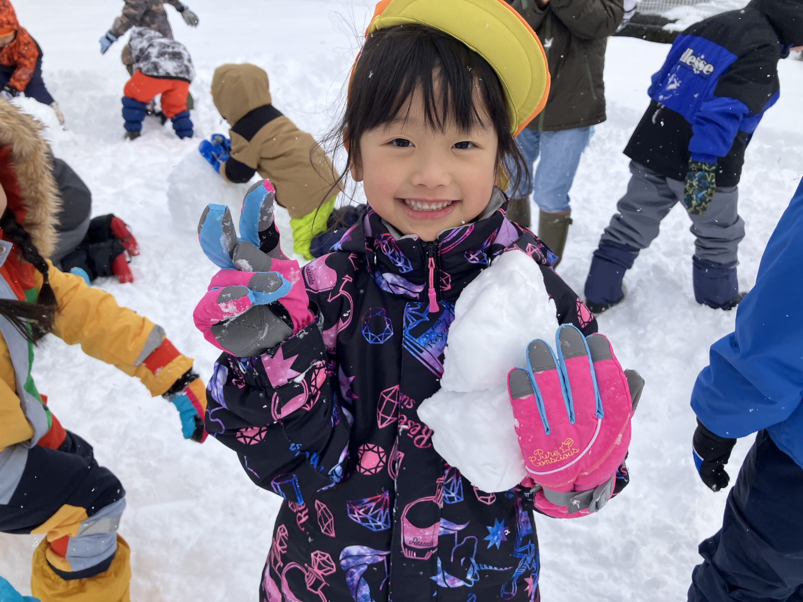 雪の上に寝転がったり、友だちと一緒に雪だるまを作ったりして、思いきり楽しむことができました♪