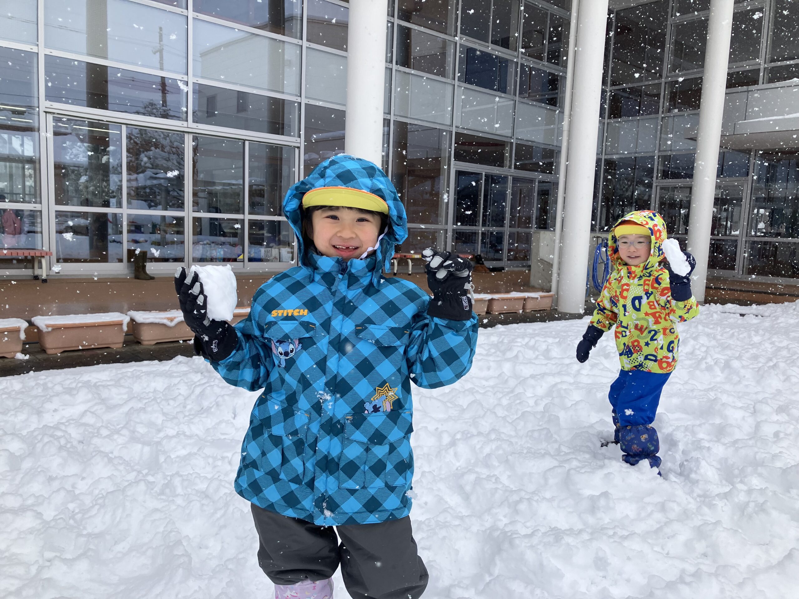 昨日・今日と雪が降り積もり、園庭や第二園庭はフワフワの雪でいっぱい!